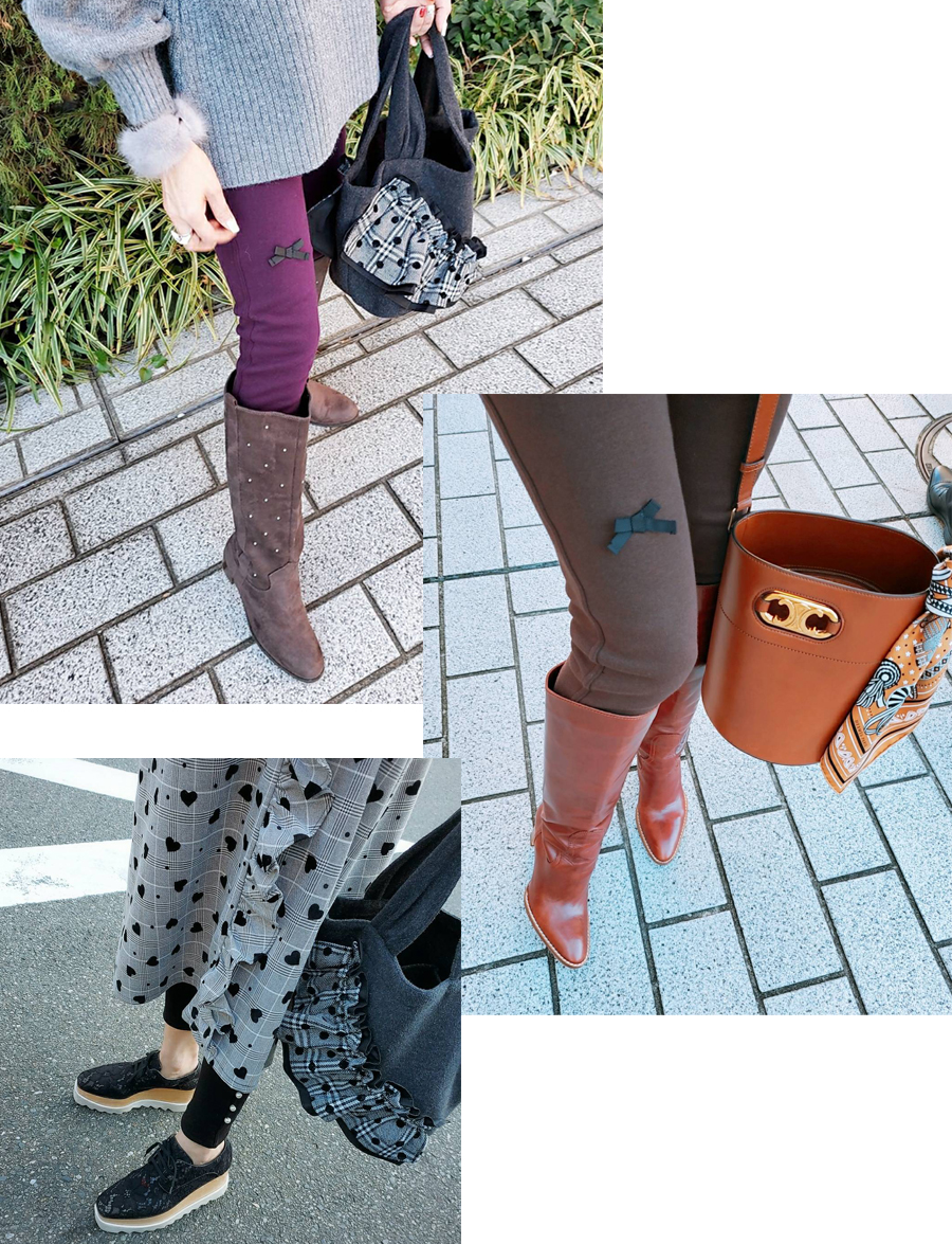 裏ボア素材のふわふわなぬくもりに加えて、右足膝部分にりぼん飾り♪裾両脇にはパール飾り♪