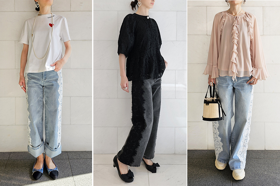 カジュアルデニムを華やかにアップグレードさせたサイドレースデニム。
