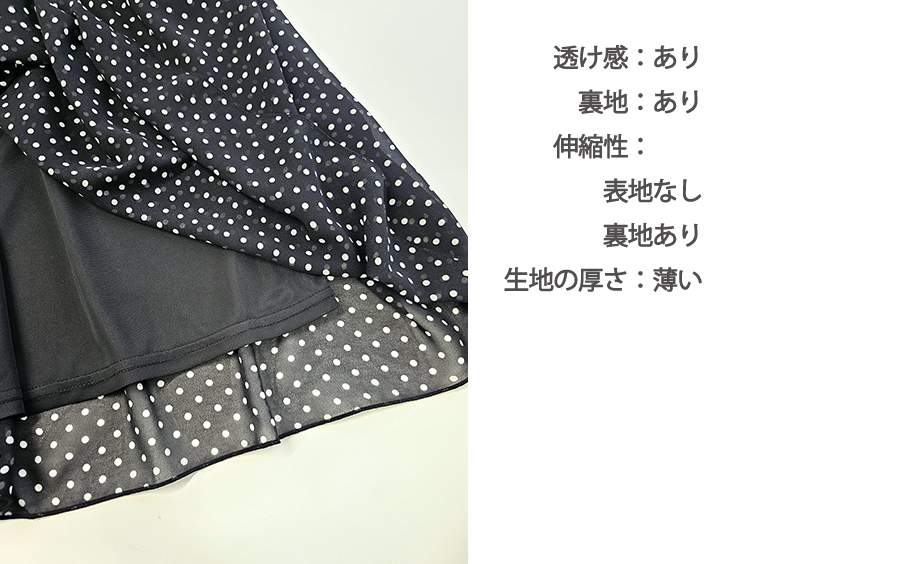 身頃部分には裏地が付いているので、透けを気にせず着用していただけます。