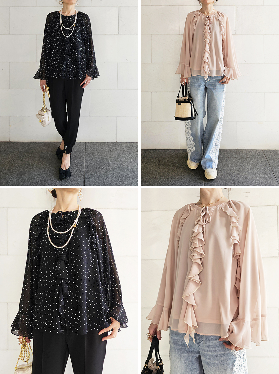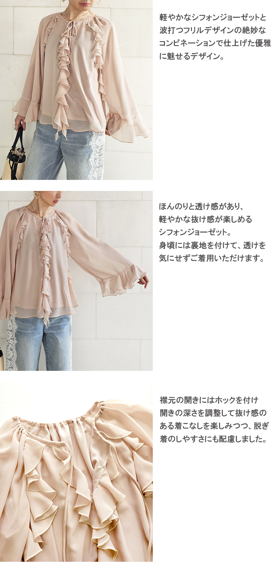 軽やかなシフォンジョーゼットを使用したフリルブラウス。ほんのり透け感のある軽やかな素材感と動きのある立体的なフリルディテールが絶妙に調和したエレガントな1着。