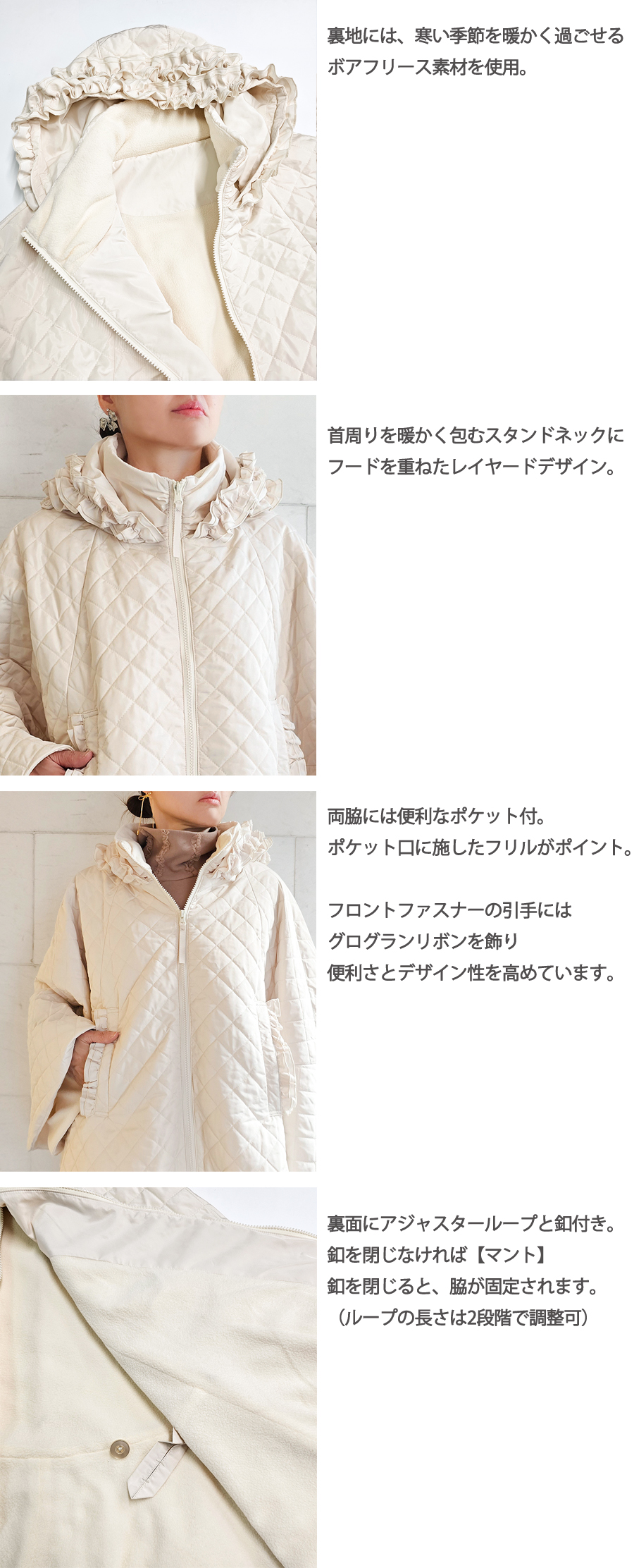 ボリューミーなフリルをあしらったフードに、首周りを暖かく包むスタンドカラーのレイヤードネックもポイントです。